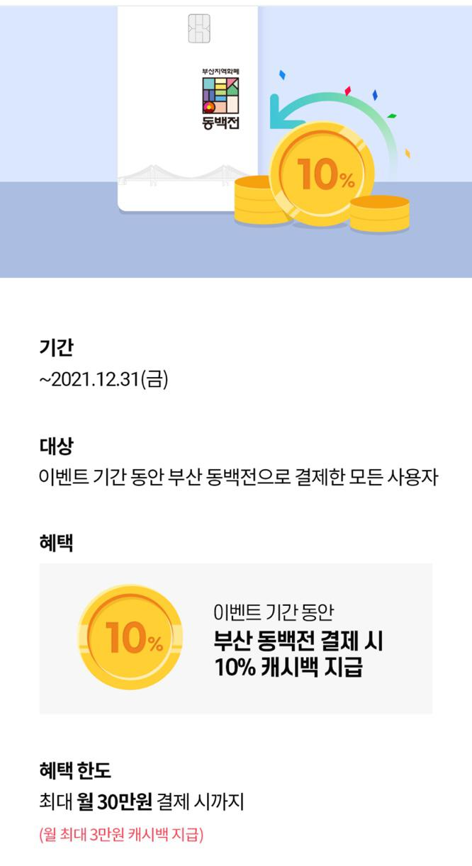 2021년 12월 31일까지 부산 동백전 결제 시 10% 캐시백 지급