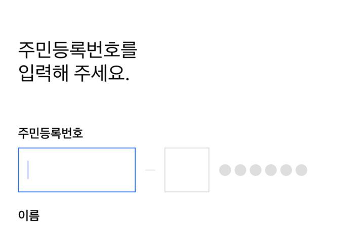 앱 실행 후 이름과 주민등록번호 메일주소를 입력하고 휴대폰 본인인증을 진행합니다.
