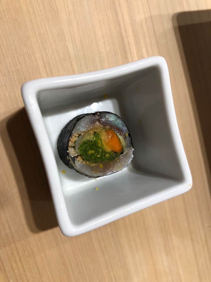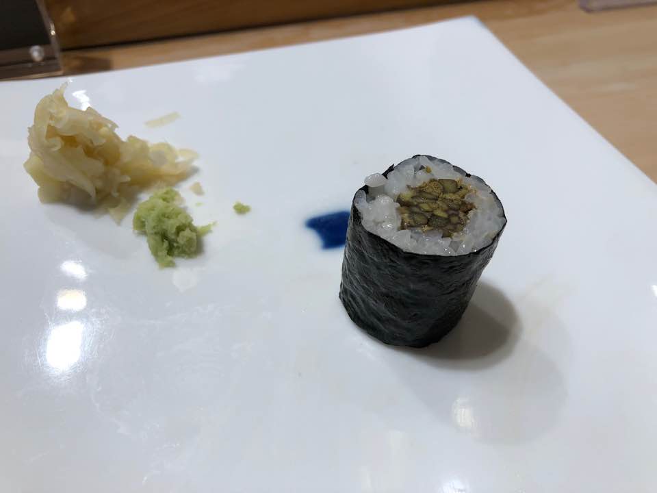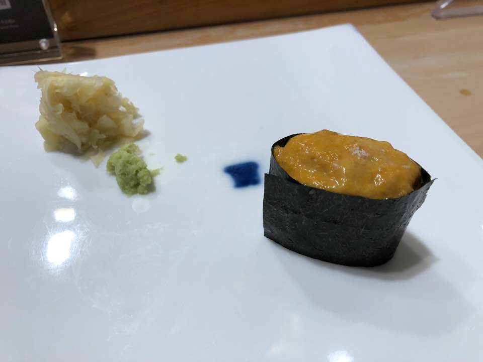 제가 평소에 좋아하는 성게알 군함이 나옵니다. 보통 성게 모양을 잡기 위해서 제품을 쓰는 경우가 많은데 스시호시카이에서는 아무것도 첨가하지 않고 자연산 성게알을 사용해서 모양이 안예쁘다고 하셨습니다.