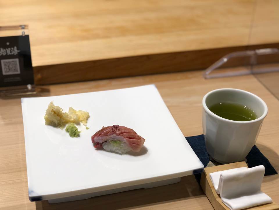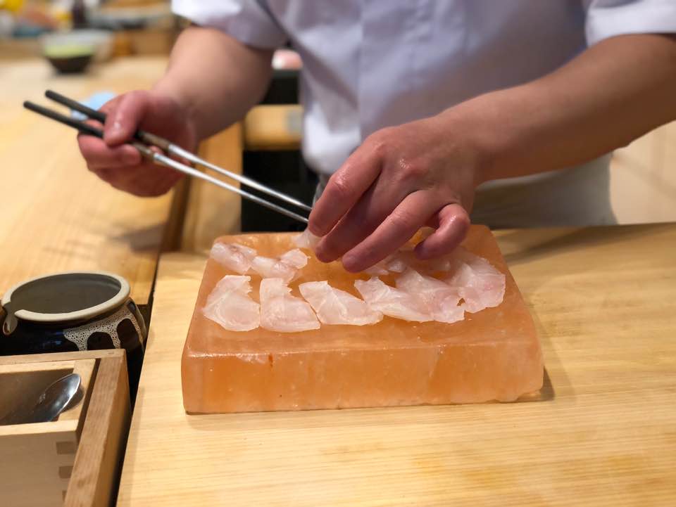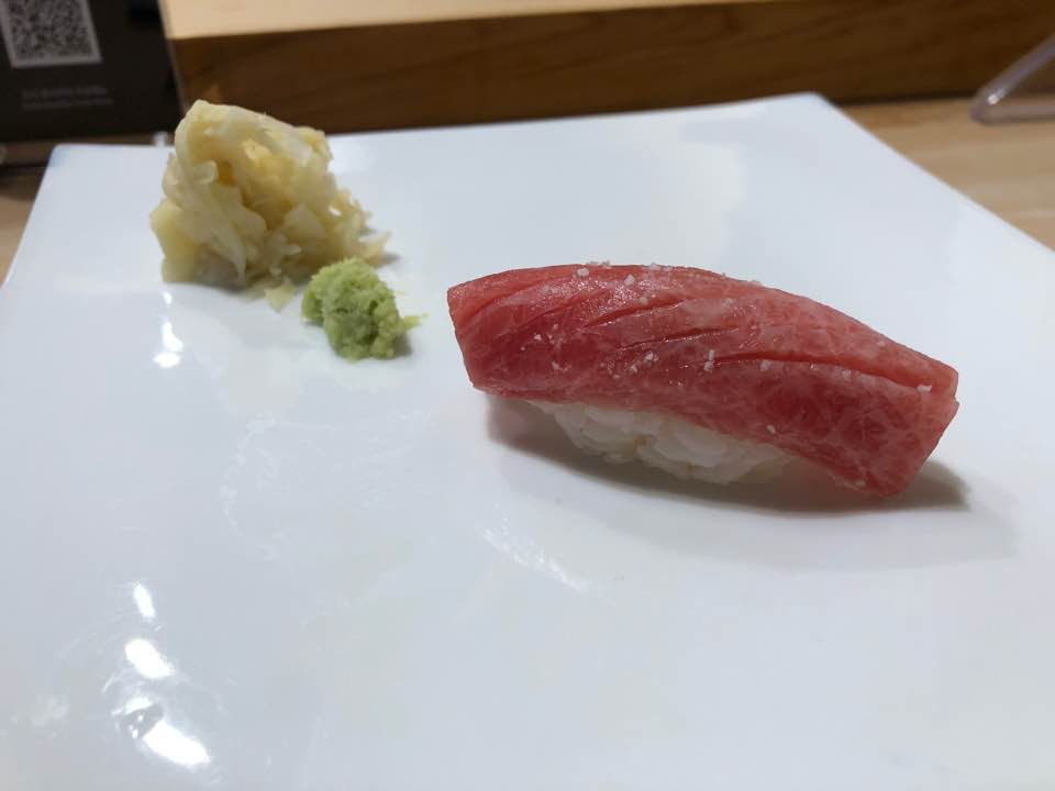 레몬셔벗으로 입가심을 하고 참치스시가 나옵니다. 지방함량이 적은 참치붉은살부터 참치뱃살, 참치대뱃살 순서로 나오는데 지방질이 많은 뱃살과 대뱃살은 소금과 와인소금을 살짝 뿌려주십니다.